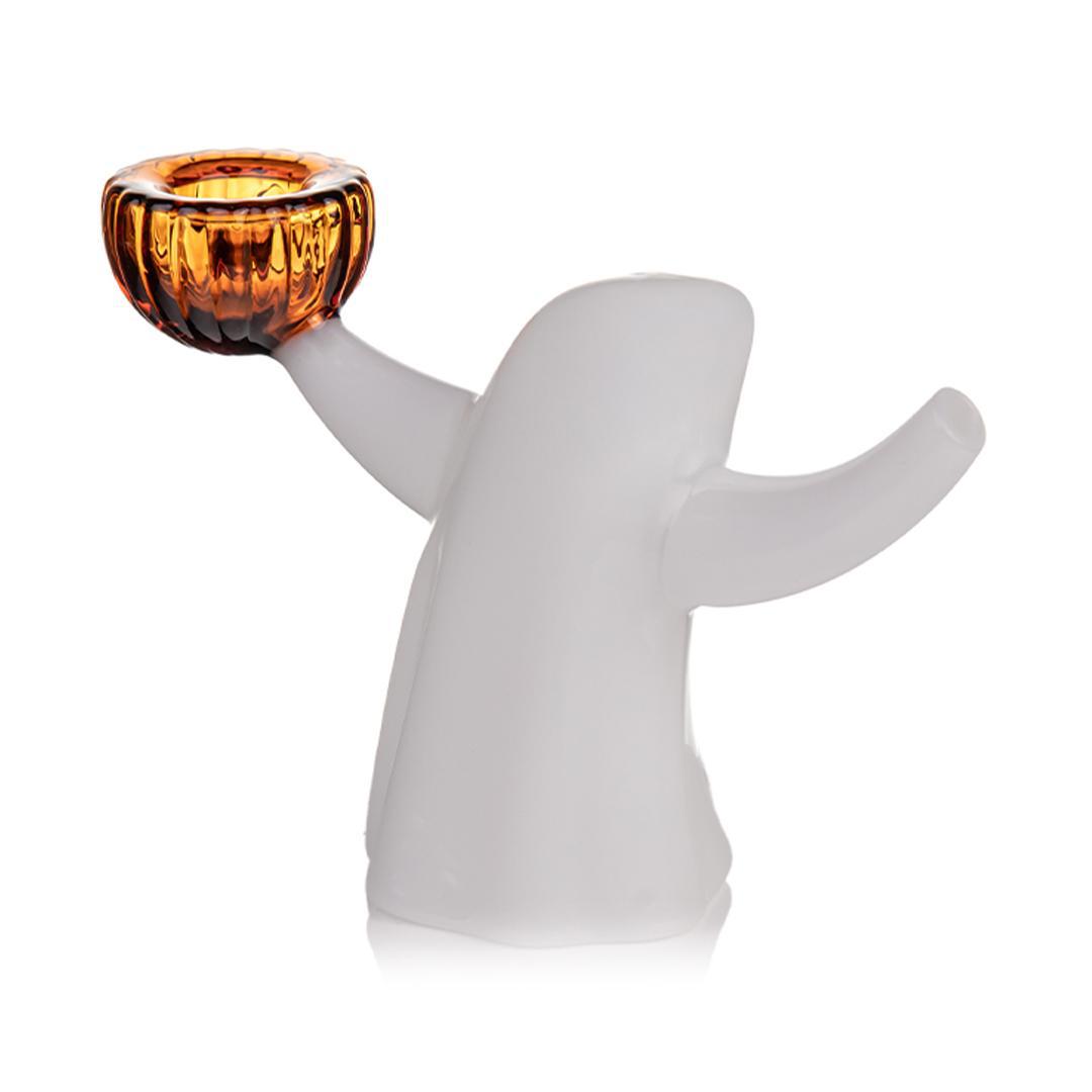 Celebrate spooky season with MJ Arsenal’s 8th Annual Limited Edition Ecto Bubbler, a pocket-friendly piece made from 100% borosilicate glass. Featuring a glow-in-the-dark ghost face, vibrant full-color Ghost & Pumpkin design, and an ergonomically placed carb hole, this handmade bubbler is as festive as it is functional.