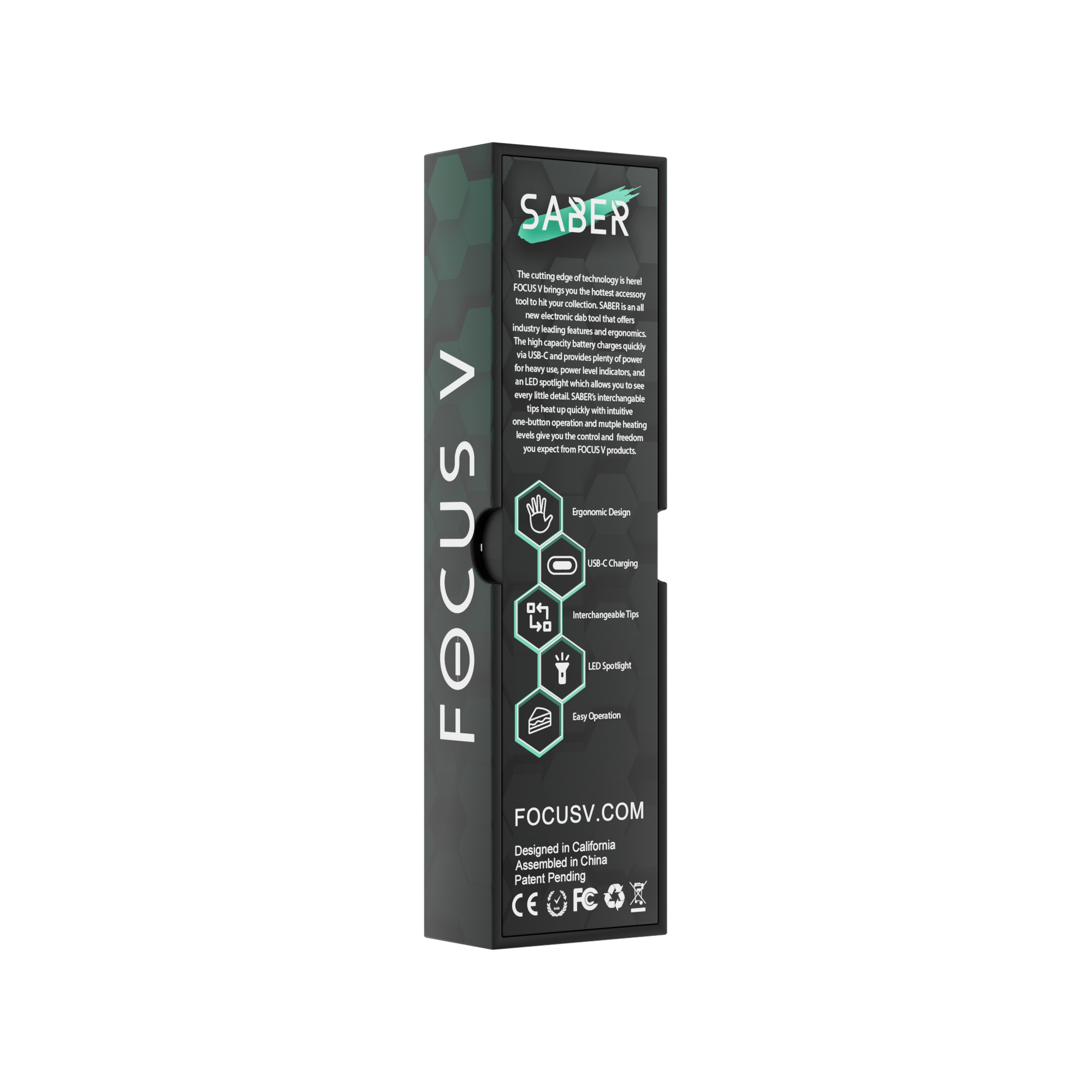 FOCUS V brings you the hottest accessory to hit your collection. SABER is an all new electronic dab tool that offers industry leading features and ergonomics. The high capacity battery charges quickly via USB-C and provides plenty of power for extended use. Equipped with 3 Power levels, an LED spotlight which allows you to see every little detail, and interchangeable tips which heat up quickly, SABER's intuitive one-button operation and multiple heating levels give you the control and freedom you expect from FOCUS V.