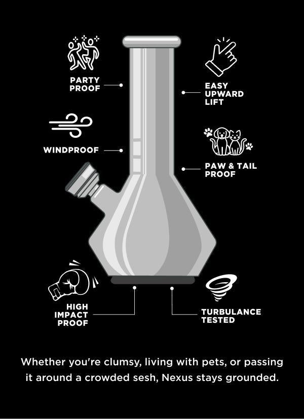 Whether you're clumsy, living with pets, or passing it around a crowded sesh, Nexus stays grounded. Handcrafted from 100% borosilicate glass and equipped with an attached downstem, ice catcher, and a 14mm accented flower bowl, it’s built for high-impact lives and high-quality hits.