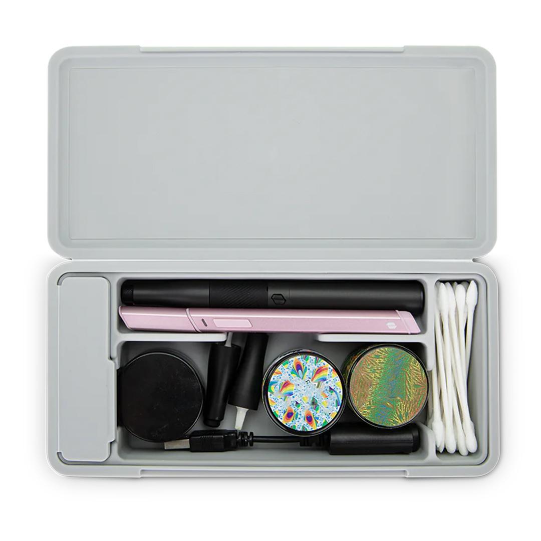The Travel Case keeps your stash organized. Featuring a ridged hard aluminum exterior with a magnetic lid closure and soft silicone inside to reduce rattling, the Travel Case has room for a Pivot + Hot Knife, up to 3 jars, cotton swabs, a covered section for trash, and anything else you might need.